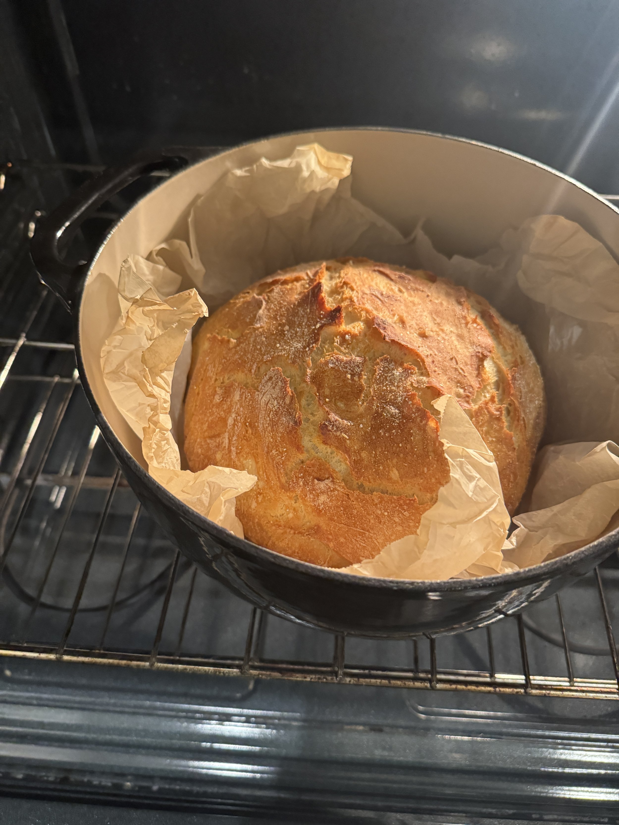 Carefully place the bread loaf in parchment in the hot pan and cover with the lid.