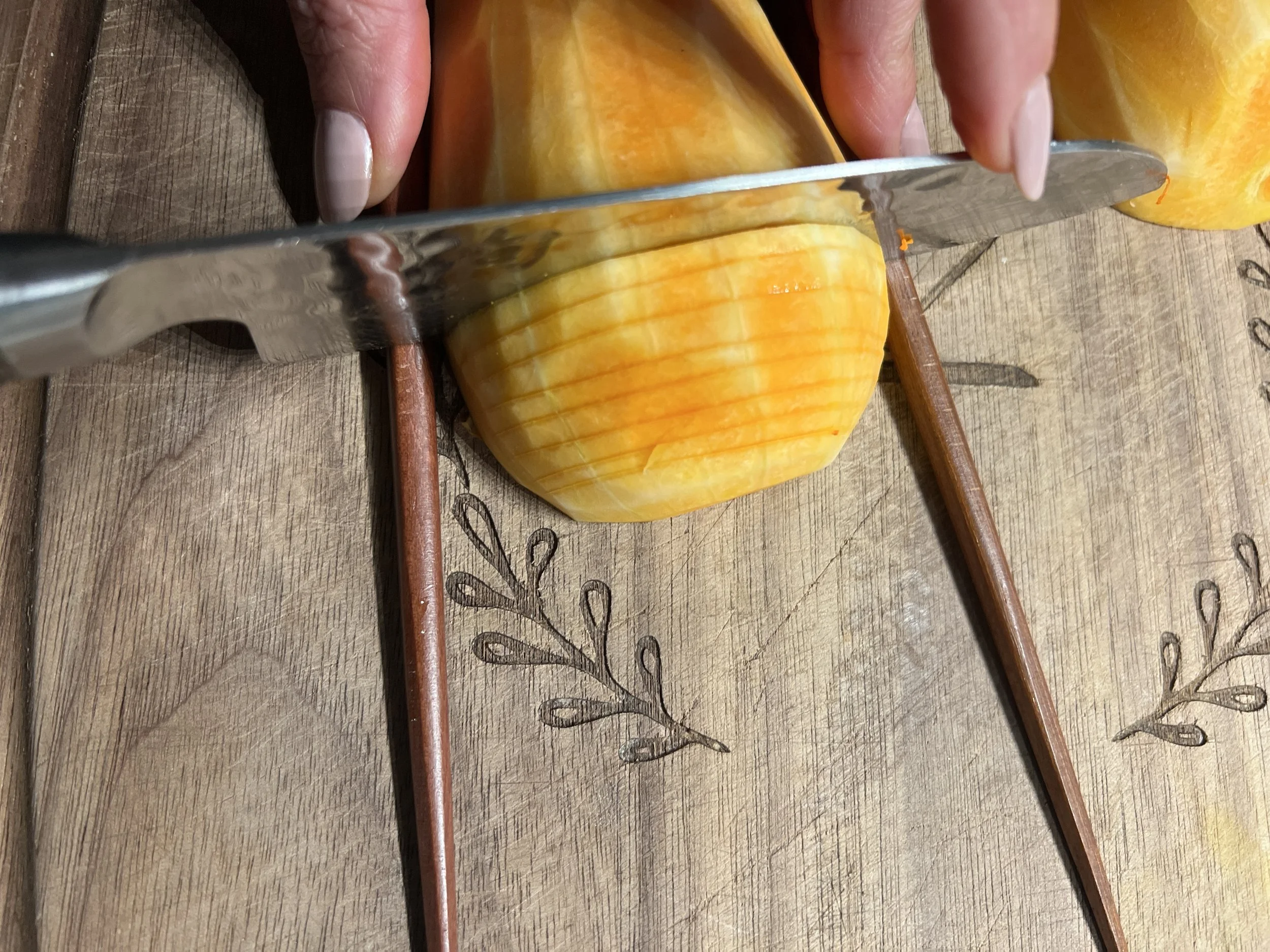 Peel butternut squash, cut in half, scoop out seeds with a spoon. Set squash halves cut side down on cutting board. Place chopsticks alongside the squash to form a ‘curb’ on both sides so you can’t cut all the way through (see pic below). Thinly make as many cuts as you can down the squash.