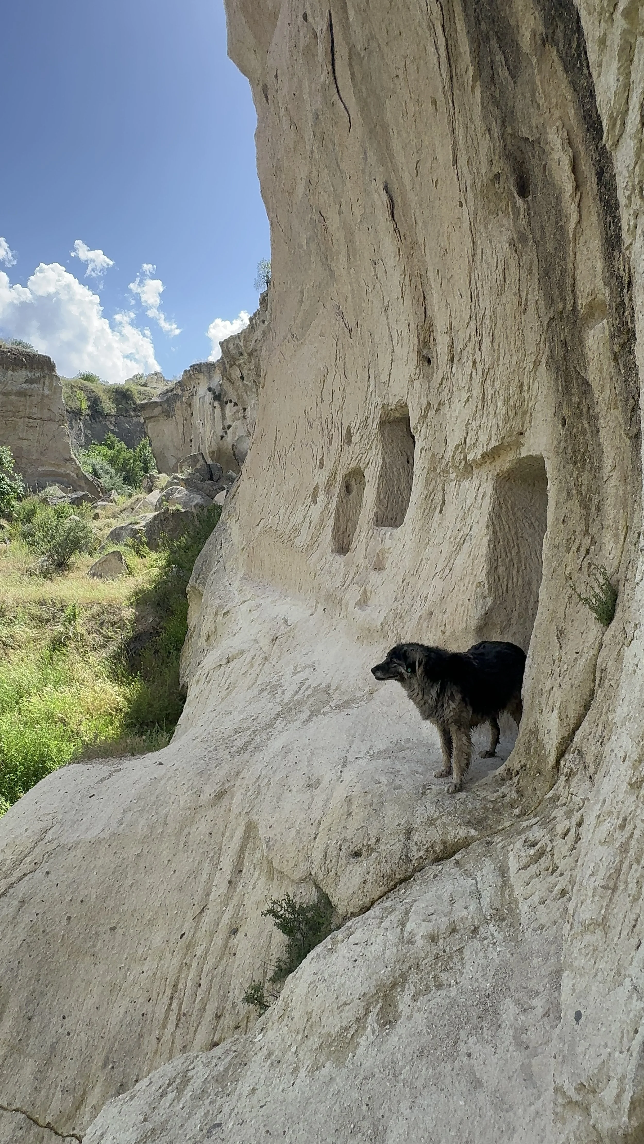 Inside, the layouts are beyond impressive. Space to sleep, rooms carved out for privacy, other areas for gathering. Carved niches for storage, cisterns for water, shelves carved in the wall for storage, treasures, closet space. The ever-present pigeon holes. There’s not a single person out here as I sit at a cave entrance, Gül panting beside me. My fingers knit into her fur, and the sun bakes the valley as I look out at the grass waving in the wind. You’d have seen whoever was coming. They’d know it was your proud home. Your dogs would be climbing steep rock entrances to sit and guard, facing outward, timelessly.