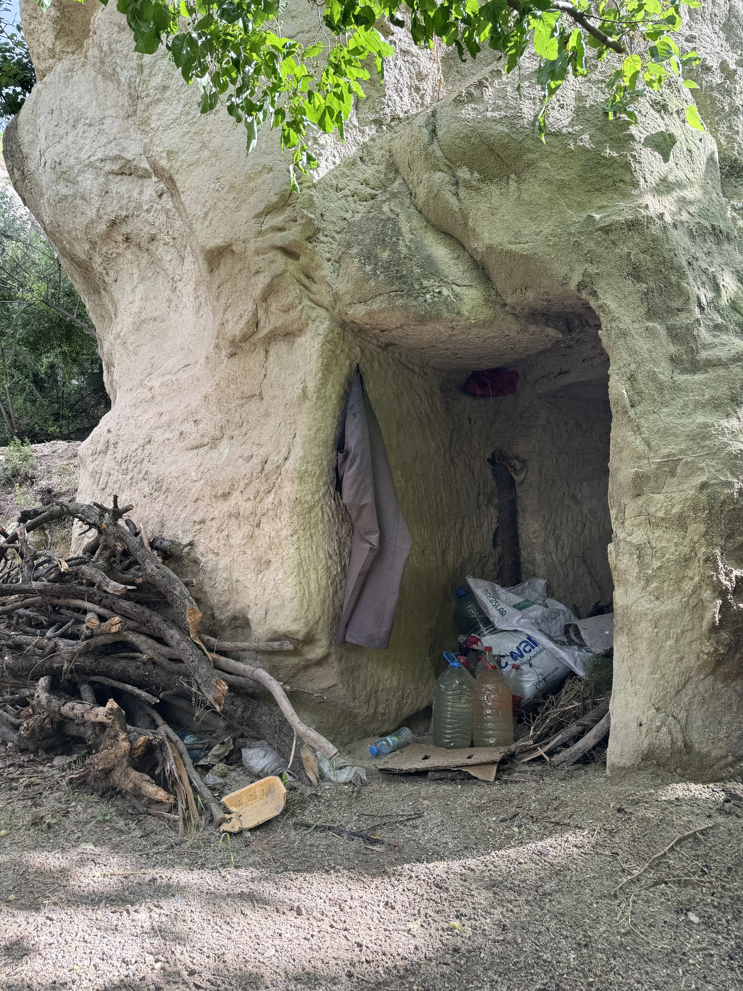 After some time we dropped the mom and her pups in the heat. Gül kept running ahead, leading the way. She'd lay down in muddy water, waiting, as if she knew we were going to Ortishihar and that we'd be good on our word to buy her lunch. We found our way through a canyon; empty cave homes gave way to a different feeling. Other dogs guarded trails that forked off from the main road, launching themselves out of thickets and bushes, aggressively barking and following until we'd brandish large staffs at them and yell. That too, felt timeless. Our dog, us, wanting passage in peace. There was something that shifted as we approached a steeper canyon. There was a little more recent trash, that didn't seem quite like trash. A styrofoam tray out by a rock, relatively new and licked clean. A particular stacking of wood that seemed intentional, but sly. We finally came up to a cave home to discover rugs rolled and stored, water jugs in a row, and a pair of pants drying, hung on a fruit tree. We stepped back down quietly, now noticing that the empty upper caves had some reinforcements—pipes for airflow, a ladder here and there, newer markings.